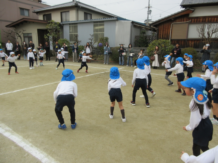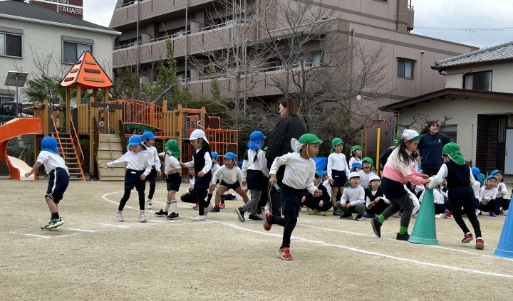 お遊戯室での昼食後、久しぶりにリレーをしてみんなで盛り上がりました。団結して一懸命に走る姿を見ていて感無量でした。「大きくなったね!」