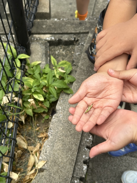 行きの電車の中で、小さくふるえていたバッタ。新祝園駅に降りて、草の上にそっと置いてあげたよ。元気でね。秋の遠足(年少組)八幡市スポーツ公園