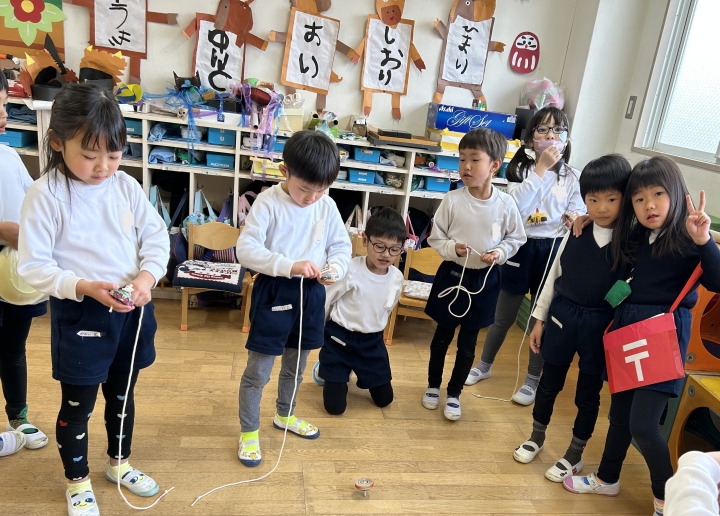 かきぞめに、ゆうびん屋さん、こままわし、カルタ… お正月あそびに満喫。