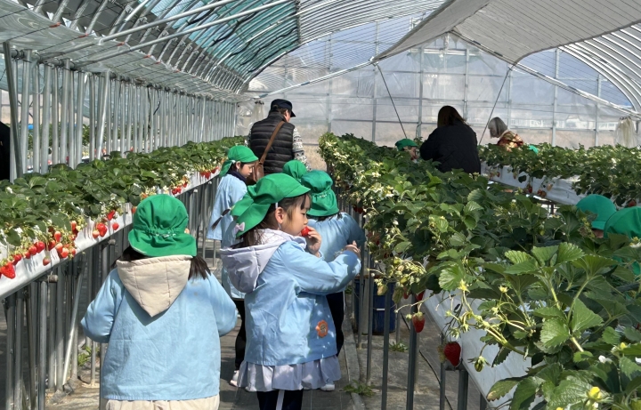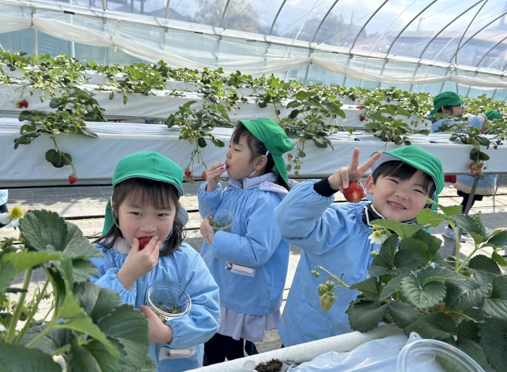 精華町の「ひろびろ苺ファーム」にいちご狩りに出かけました。ハウスに入ると甘い香りがいっぱい。夢中になって赤いいちごを探し、いつも賑やかな子どもたちが無言でモリモリ食べていました。「美味しかったね!」