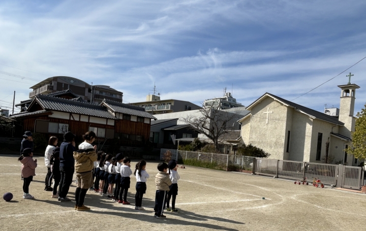 東日本大震災の日から15年。毎年、京田辺市のお寺や神社、教会でこの時間に鐘を鳴らして追悼をします。カトリック田辺教会でも、園長が鐘を鳴らしました。預かり保育に来ていた子どもたちも、お外遊びの手を止めてお祈りをしました。何年たっても悲しい思いは残ると思いますが、被災された方、亡くなられた方が安らかになられますよう願っております。
