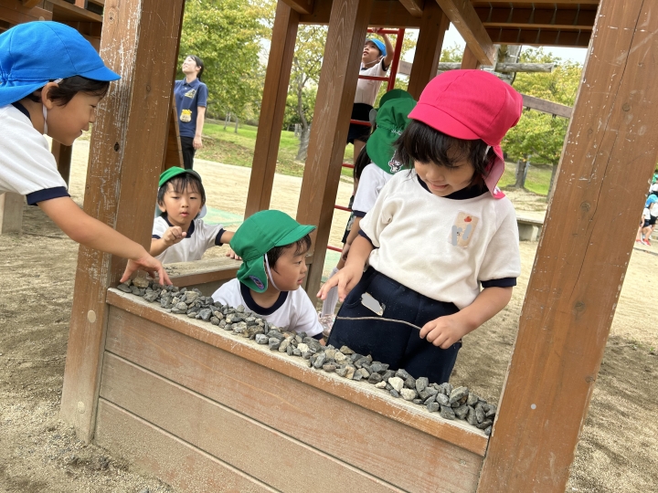 秋晴れに恵まれ、自然の中で楽しく過ごしました。遊具や小川で遊んだり、土に絵を描いたり、芝生の坂を段ボールで滑ったり… したいことがたくさんあって、あちこち移動して忙しそうに遊んでいました。