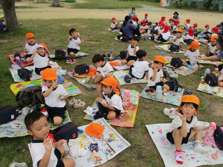 青空の下で食べたおにぎり、おいしかったね。紙切り遊び