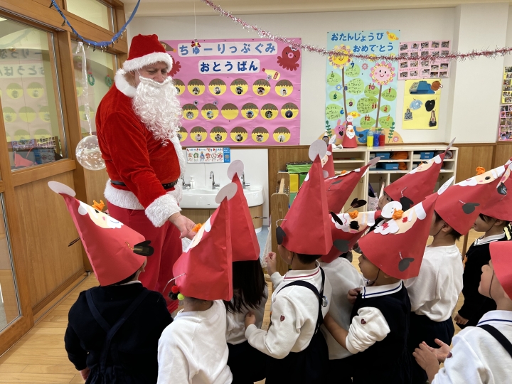サンタさんがプレゼントをもってみんなのお部屋に来たよ。英語でご挨拶したね。