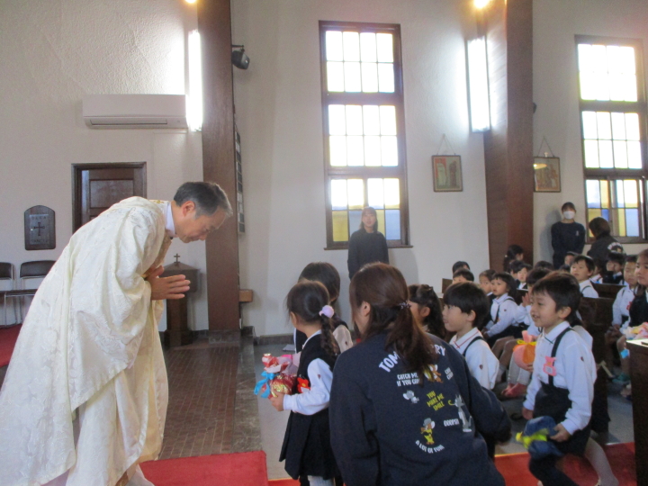 神父様に祝福の祈りをしていただき、聖水をかけていただきました。お恵みでいっぱいになったね。千歳飴も大事に持って帰りました。勤労感謝の集い